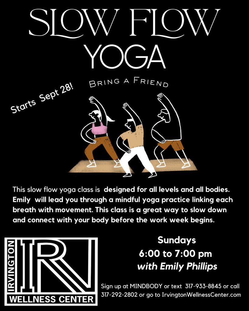 I teach Slow Flow every Saturday morning 9-9:50 at Movement House downtown Indianapolis! You can also join me Monday evenings for Warm Slow Flow 7:30-8:20 pm.